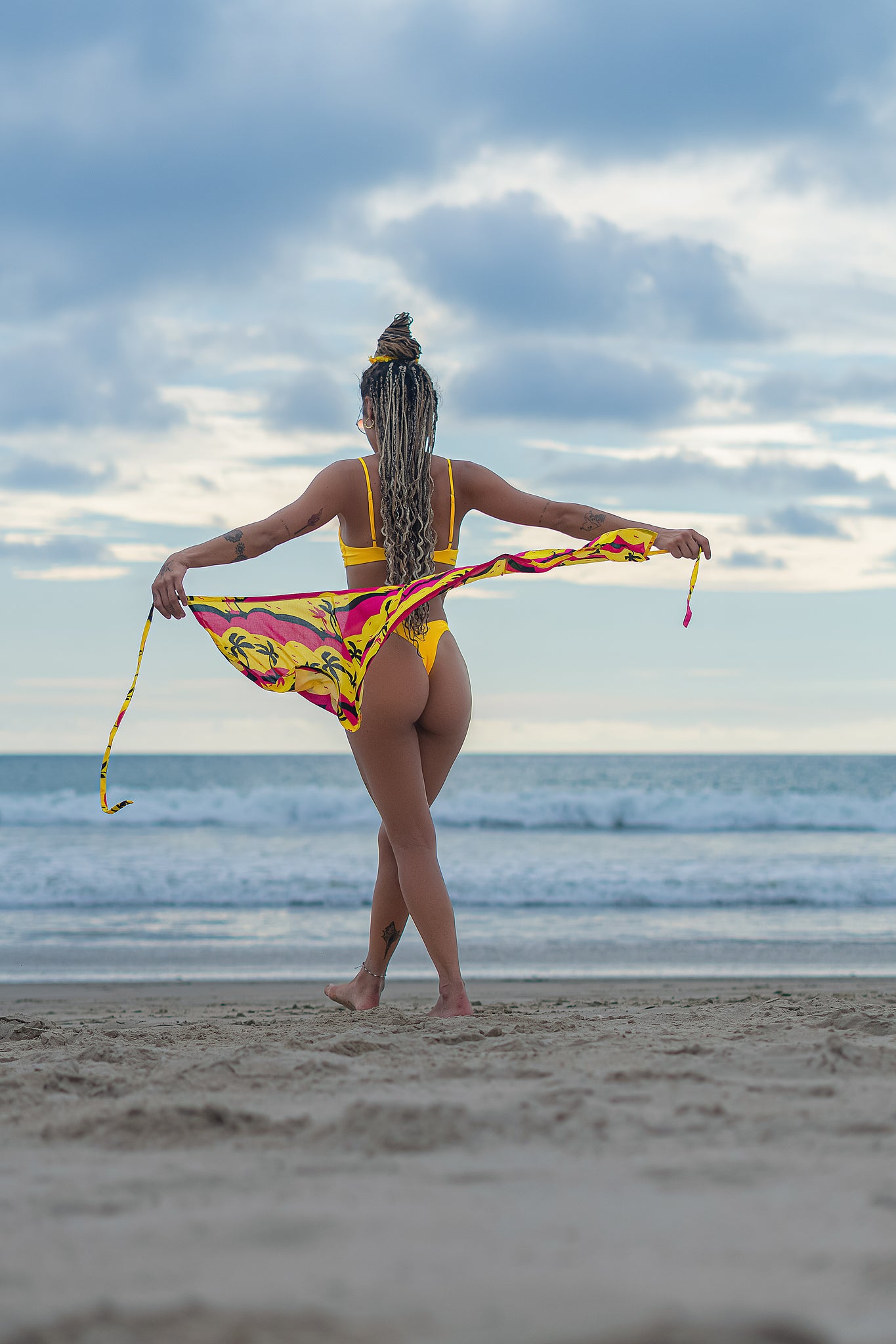 Traje de baño de dos piezas, confeccionado en doble tela con costuras invisibles y elásticos internos. Top escote en V estilo triángulo entero con nudo en el centro del busto, breteles regulables, broche en espalda, cuenta con espacio para colocar almohadillas push up desmontables. Bottom en V tiro alto, con detalle de nudos a cada lado. Back: Hilo.
